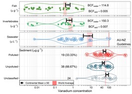 Vanadium is part of many industries and products, and its use has increased significantly over the last two decades. Our research gathered information from over 250 articles and found that the concentration of vanadium in marine organisms has similar trends to worldwide use and production of vanadium. Here, we further investigated multiple characteristics of vanadium in coastal ecosystems (sediment, water, biota) and its ecological and health risks. There is a need further to explore the hazards and toxicity of this metal and set new guidelines to protect aquatic species that, from the available data and reported concentrations, are likely to be at risk under our SSD analysis. Vanadium is a rarely investigated heavy metal despite similarities with other traditional elements like arsenic or mercury. Nonetheless, it has gained significant importance in our society, whereby it is essential to control and monitor its occurrence and distribution.